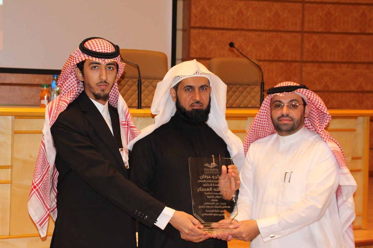 بالتعاون مع وحدة التوعية الفكرية بوكالة الجامعة للشؤون التعليمة والأكاديمية، أقامت كلية الهندسة بالخرج ممثلة بوحدة التوعية الفكرية بالكلية وضمن مشروع نحو جامعة واعية -1- محاضرة بعنوان حديث عن المستقبل قدمها سعادة الدكتور عبدالله العسكر رئيس قسم الدراسات الإسلامية بكلية التربية بالجامعة وذلك يوم الأثنين 1438/3/13هـ .حضر المحاضرة عدد من طلاب الكلية وأعضاء هيئة التدريس والتي شملت العديد من المحاور في مجال التخطيط للمستقبل. في نهاية المحاضرة، قدم سعادة وكيل كلية الهندسة الدكتور بندر الزهراني شكره وتقديره لسعادة الدكتور عبدالله العسكر وقدم له درع الكلية التكريمي نيابة عن عميد الكلية.