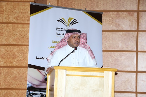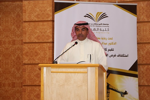 وفي كلمة لعميد كلية الهندسة الدكتور محمد بن سعيد القحطاني في هذه المناسبة رحب بمعالي مدير الجامعة وأصحاب السعادة الحضور وتقدم بجزيل الشكر لمعالي مدير الجامعة على ما تجده كلية الهندسة وطلابها من دعم ورعاية حققت لها الكثير من المنجزات والتي من أهمها حصول الكلية على الاعتماد الأكاديمي الأمريكي. كذلك تحدث سعادته أن هذه الورشة تهدف إلى مد جسور التعاون مع الكثير من الجهات والقطاعات الهندسية والتي أثمرت في هذه المناسبة عن مشاركة 15 جهه وحضور ما يقارب 36 ممثل لهذه الجهات حيث خرج المشاركون بالتأكيد على أهمية التعاون المشترك في تأهيل مهندس المستقبل وضرورة بذل الجهود في تقديم فرص حقيقة للتدريب العملي بهدف صقل مهارات الطلاب. كذلك نوه في كلمته عن خطة الكلية الإستراتيجية في برامج التدريب الصيفي والتي تهدف إلى خلق شراكة حقيقية ومستدامة مع شركات القطاع الخاص ذات العلاقة كمسئولية ملحة تجاه أبناء الوطن الذي يعتبرون المحور الأساسي في تنمية وازدهار الوطن. وفي ذلك الإطار أعدت مسودة اتفاقية تعاون تم اعتمادها من معالي مدير الجامعة ويجري العمل على إبرامها مع العديد من القطاعات وسيتم توقيع باكورة هذه الاتفاقيات خلال هذه الورشة مع شركة المراعي كأحد الشركات الوطنية الكبيرة والفاعلة في المنطقة وفي المحافظة تحديدا.