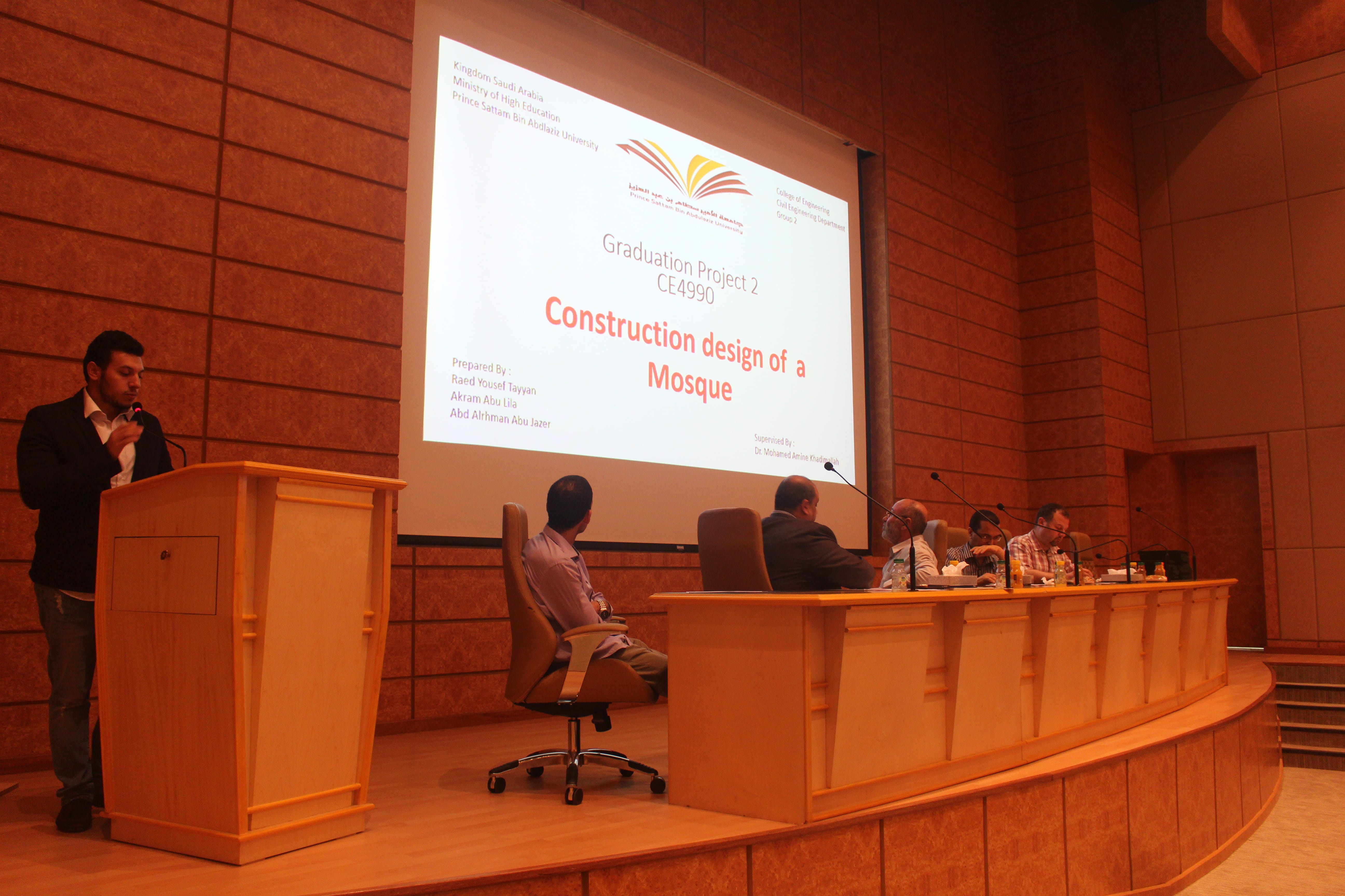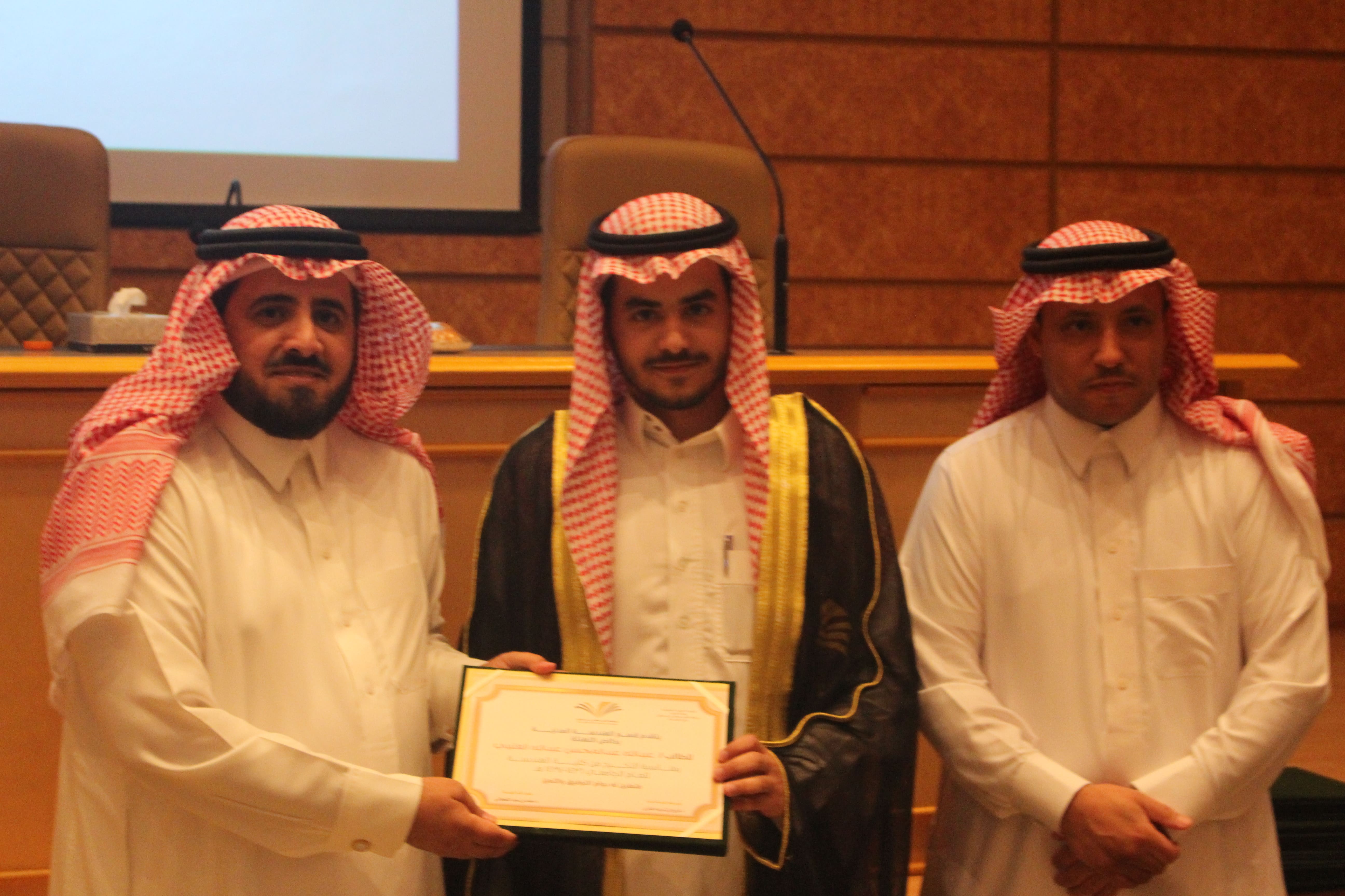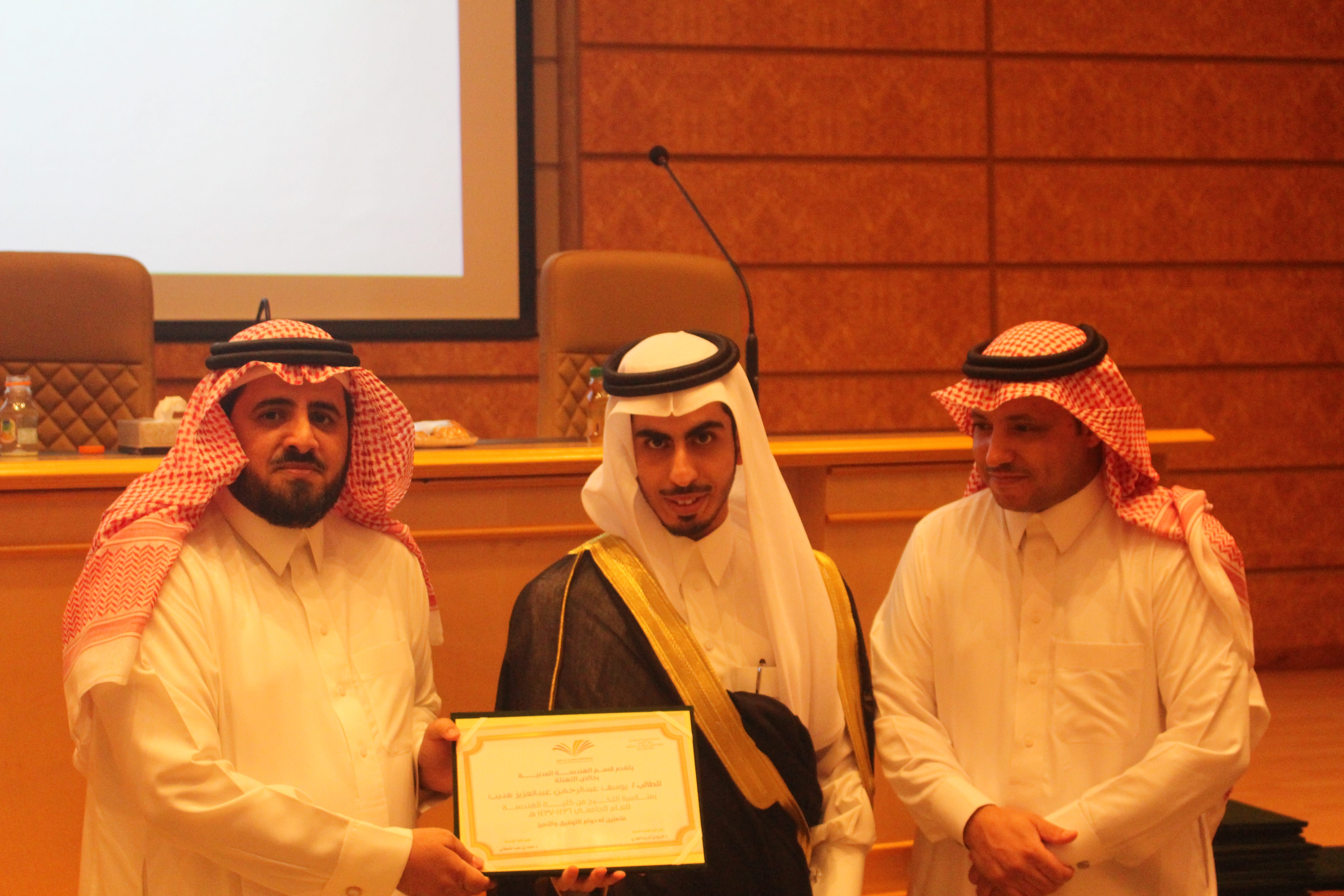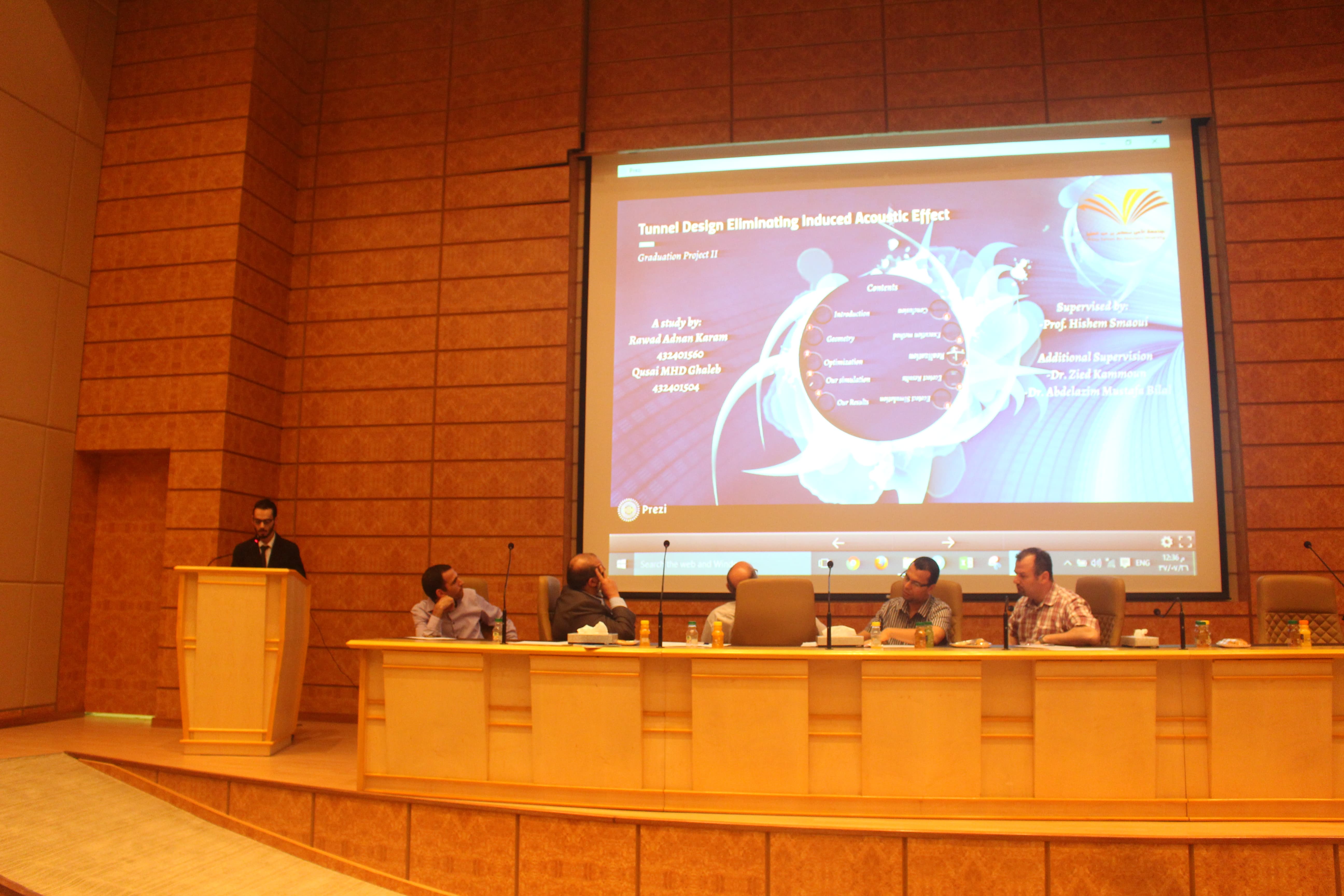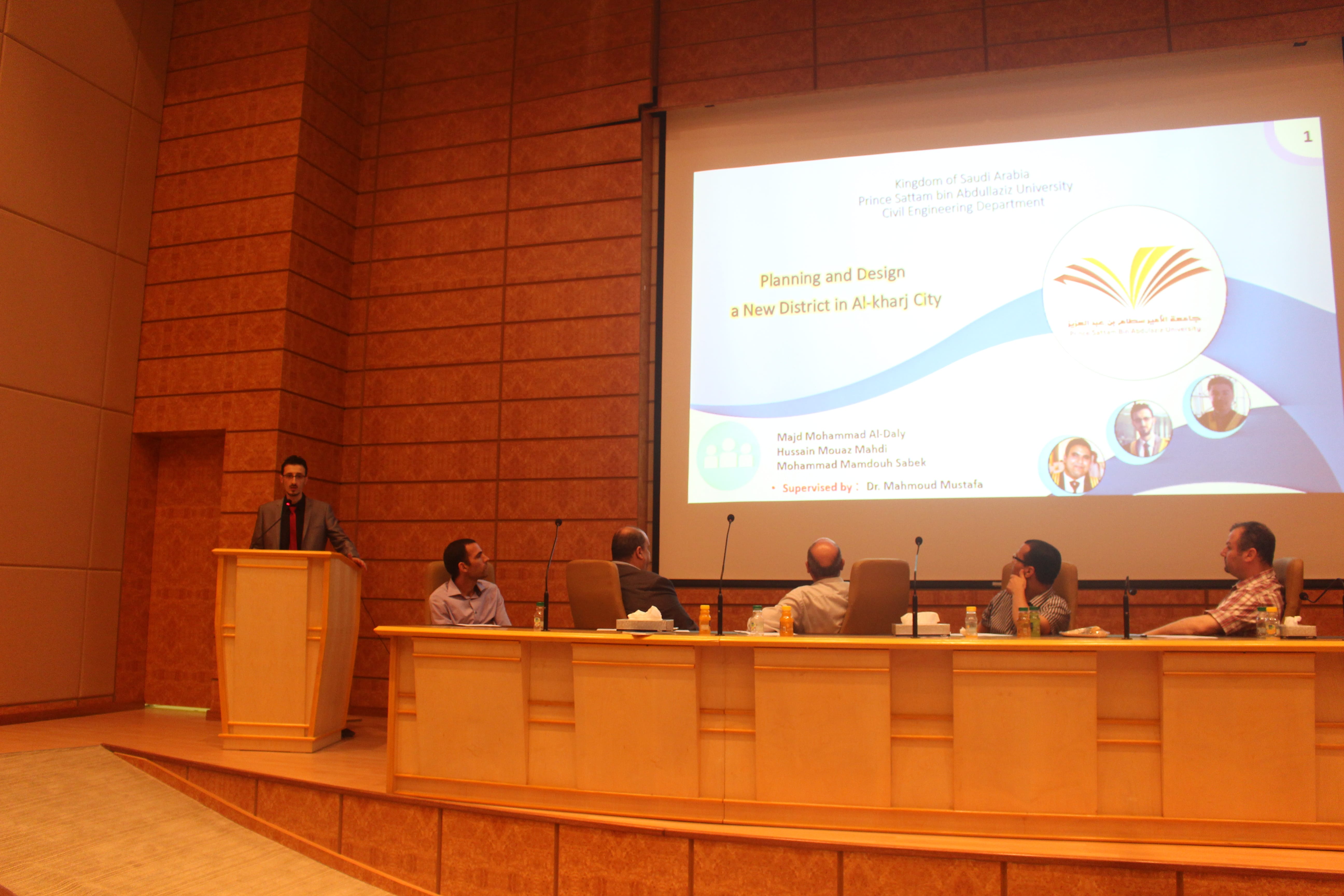 برعاية وحضور من عميد كلية الهندسة الدكتور محمد بن سعيد القحطاني أقام قسم الهندسة المدنية مسابقة بين مشاريع التخرج الطلابية بهدف خلق بيئة تنافسية بين الطلاب من اجل التميز في مخرجات المشاريع الطلابية. وكذلك تم الاحتفاء بخريجين القسم لهذا العام. وفي كلمة لسعادة عميد الكلية وجه تهنئتة لطلاب المشاريع الفائزه متمنيا لهم المزيد من التميز وكذلك قدم تهنئتة للخريجين مبدئيا اعتزاز الكلية بتخريج دفعة جديدة من المهندسين والذي من المامول ان يكون لهم اسهامات في مجال تخصصهم وسد احتياج البلد في القطاع الهندسي. وكذلك وجه شكره وتقديره لمنسوبي قسم الهندسة المدنية على جهودهم الحثيثة في خدمة الطلاب وابراز مشاريعهم المتميزه. وفي كلمة لرئيس قسم الهندسة المدنية الدكتور فريح بن شريده العنزي شكر فيها اعضاء هئية التدريس على جهودهم المخلصة نحو تميز العملية التعليمية والاشراف الدقيق على مشاريع التخرج. كذلك قدم تهنئتة لطلاب مشاريع التخرج مثمنا جهودهم في انجاز المشاريع بمخرجات متميزه وكذلك قدم تهنئتة للخريجين متمنيا لهم التوفيق في حياتهم العملية وان يستمر التواصل مع القسم ليكونو جزء من عملية التطوير. بعد ذلك تم اعلان نتائج مشاريع التخرج حيث حصل على المركز الاول مشروع التخرج المقدم من الطالب رواد كرم والطالب قصي غالب وتحت اشراف الدكتور هشام السماوي حيث يهدف المشروع الى تطوير انفاق طرق ذات مستوى ضجيج منخفض. وكذلك اعلنت اللجنة المقيمة بمنح المركز الثاني مناصفة بين المشروع المقدم من الطالب رائد التيان والطالب عبدالرحمن ابو جزر والطالب اكرم ابو ليلى تحت اشراف الدكتور محمد امين خديم الله والذي يهدف الى تطوير تصميم ممتيز لمسجد مع وجود محطة معالجة لمياه الوضوء وكذلك المشروع المقدم من الطالب محمد سابق والطالب مجد الدالي والطالب حسين مهدي تحت اشراف الدكتور محمود مصطفى والذي يهدف الى تطوير مجمع سكني بخدمات متكاملة في احد المخططات المحيطة بالجامعة. وفي نهاية اللقاء كرم عميد الكلية الدكتور محمد بن سعيد القحطاني ورئيس قسم الهندسة المدنية طلاب المشاريع الفائزه وكذلك تم تقديم شهادات التهنئة للخريجين.