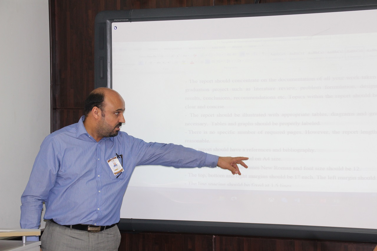 بتوجيه عميد كلية الهندسة الدكتور محمد بن سعيد القحطاني نحو تنظيم محاضرات توجيهيه وإرشاديه لتعزيز مخرجات مشاريع التخرج فقد أقامت وحدة الأنشطة الطلابية بالكلية وعلى مدار ثلاث ايام سلسلة محاضرات بعنوان مشروع التخرج الناجح لطلاب الأقسام العلمية في الكلية، الهندسة الكهربائية والميكانيكية والمدنية، قدمها مجموعة من أعضاء هئية التدريس بالكلية. تركزت المحاضرات على إبراز دور مشروع التخرج كفرصة في إكساب الطلاب المهارات التطبيقية التي درسوها في العديد من المقررات كذلك شملت تسليط الضوء على أهمية مشروع التخرج في إكساب الطالب مهارات البحث العلمي والعمل الجماعي وأهمية التحصيل الجيد في مشاريع التخرج حيث يعد من العوامل المهمه المعتبرة لدى جهات التوظيف . وتم تعريف الطلاب بخطوات أنجاز مشاريع التخرج والاطلاع على العديد من المهارات الضرورية نحو مشروع تخرج ناجح . شارك في تللك المحاضرات العديد من طلاب الأقسام وخصوصا طلاب مشاريع التخرج حيث كانت المشاركة إلزامية لما لها من أهمية كبيرة في مساعدة الطالب في أنجاز مشروع التخرج بشكل متميز