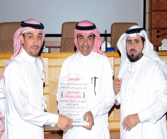 وفي نهاية الحفل الخطابي كرم معاليه عميد كلية الهندسة السابق الدكتور أسامة بن سعد آل ظافر على ما بذل من جهد منذ أن كان وكيلاً لكلية الهندسة ثم عميدًا لها، بعدها كرم معاليه الوفد الزائر من جامعة كاليفورنيا إرفاين والطلاب المشاركين في برنامج التعاون الدولي.