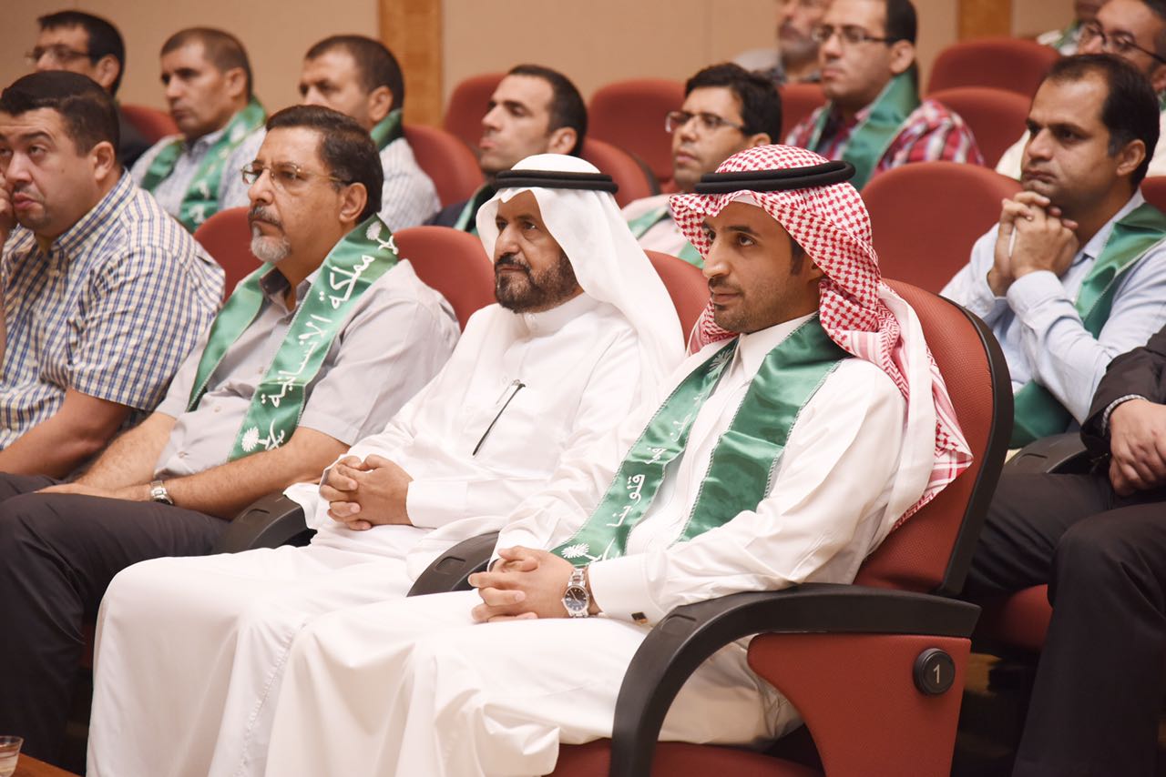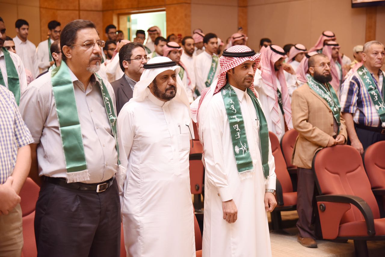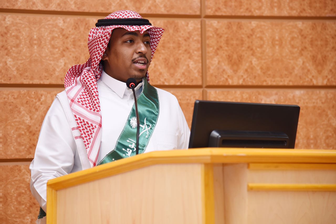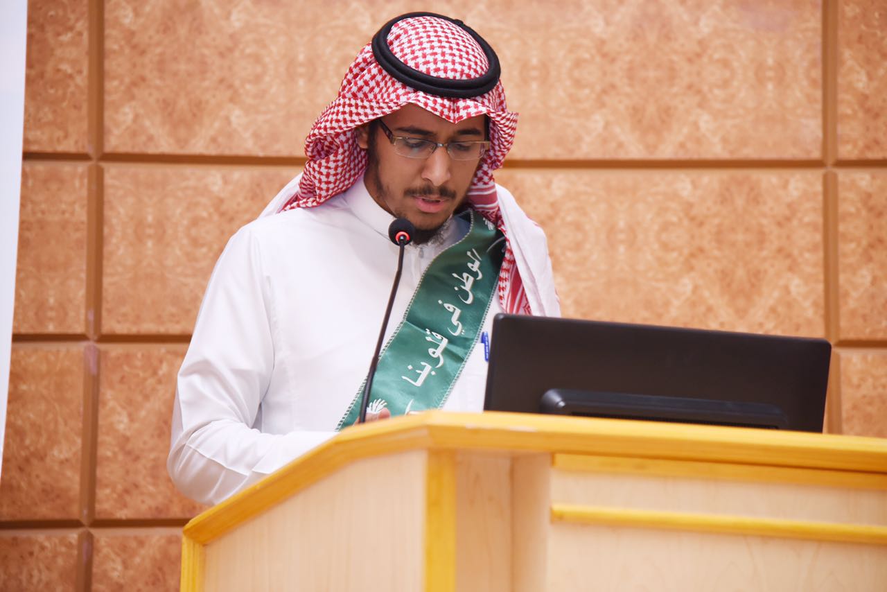 وقد افتتح الحفل بالسلام الوطني بعد ذلك قدم الطالب/ خالد الزعاقي الحفل الخطابي بهذه المناسبة حيث تليت آيات من الذكر الحكيم تلاها الطالب/ لؤي بن عبدالله الرويتع ، عقب ذلك كلمة لسعادة المشرف على كلية الهندسة المكلف الدكتور رائد بن عبدالله اليوسف عبر فيها عن مشاعر الاعتزاز والفخر والولاء للدين ثم المليك والإنتماء للوطن واستذكر سعادته الدور الريادي لمؤسس هذا الكيان الملك عبدالعزيز طيب الله ثراه وأبناؤه من بعده وما نقطفه من ثمرة جهودهم المباركة حتى أصبحنا نعيش واقع الأمن والأمان والرغد والإزدهار. وأضاف، أن حب الوطن والوطنية ليست شعارات ولا أهازيج، بل إنجاز وعمل وبناء. ودعى الله أن يعز ديننا و يحمي بلدنا ويحفظ لنا ولاة أمرنا ويرحم شهدائنا وأن يثبت مرابطينا. وفي ختام كلمته، قدم شكره للجان المشرفة على هذه الفعالية وعلى رأسها إدارة كلية الهندسة وفي لجنة الأنشطة الطلابية بالكلية واللجان المساندة لها.