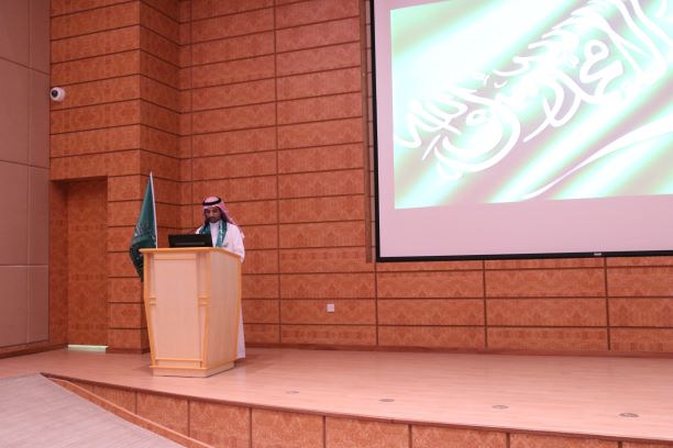 افتتح الحفل بآيات من الذكر الحكيم تلاها الطالب عمر الإبراهيم, بعد ذلك ألقى عميد الكلية المكلف الدكتور رائد بن عبدالله اليوسف كلمة مرحباً فيها بالحضور الكرام في هذا الاحتفال رافعاً أسمى آيات التهاني والتبريكات لمقام خادم الحرمين الشريفين الملك سلمان بن عبدالعزيز حفظه الله ورعاه وإلى مقام سمو ولي عهده الأمين صاحب السمو الملكي الأمير محمد بن سلمان بن عبدالعزيز بمناسبة هذه الذكرى الغالية على قلوبنا جميعاً.