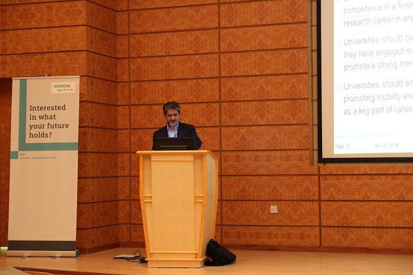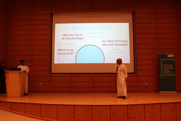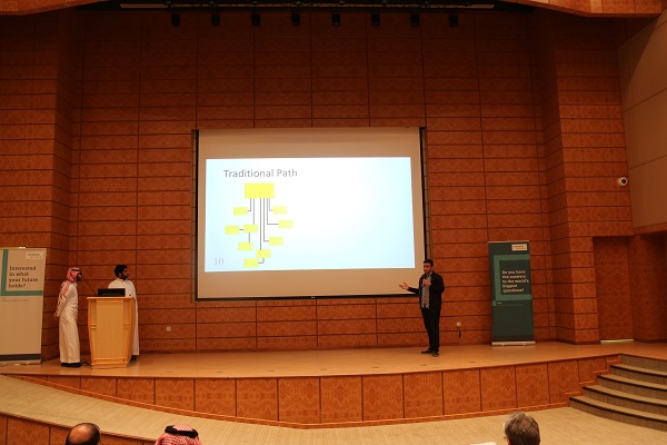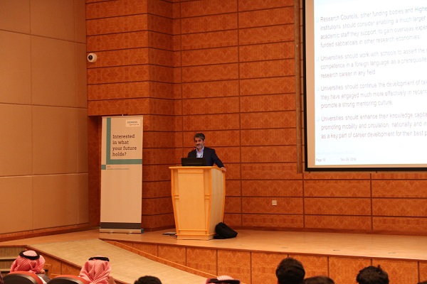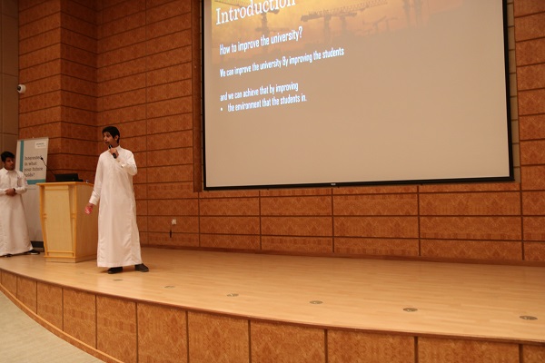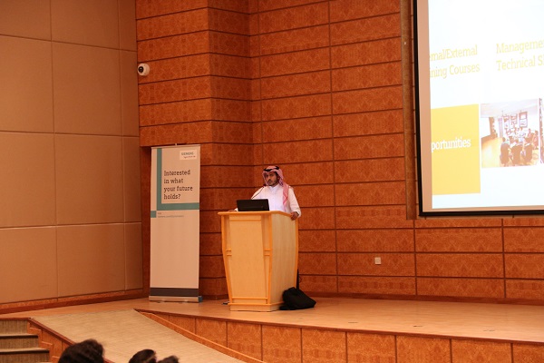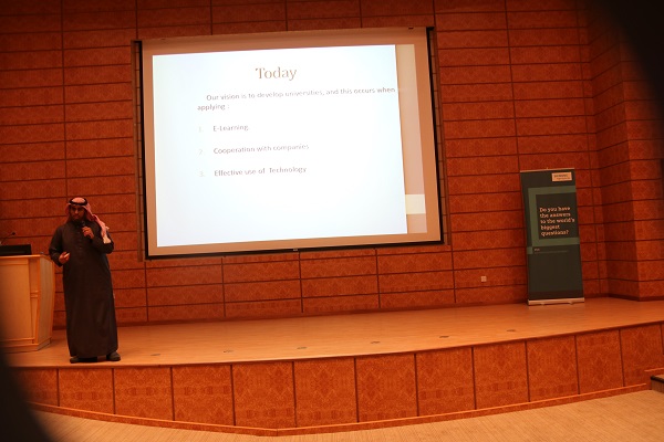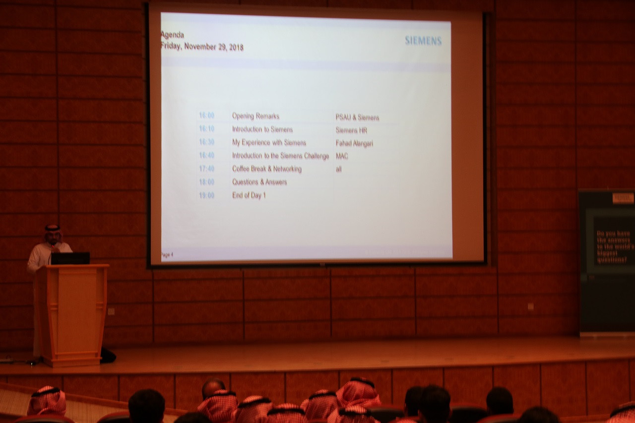 حرصاً من كلية الهندسة بالخرج ومبادرتها في مد جسور التواصل مع القطاع الخاص، أقامت الكلية وتحت رعاية سعادة عميد الكلية المكلف الدكتور/ رائد بن عبدالله اليوسف وبالتعاون مع شركة سيمنس وعلى مدى ثلاثة أيام فعالية تحت عنوان "الجامعات في المستقبل" والتي تستهدف طلاب الجامعة من مختلف التخصصات وذلك من خلال إشراكهم في وضع الحلول المقترحة لما سيكون عليه شكل الجامعات في المستقبل، حيث تنافس الطلاب خلال مدة الفعالية على ابتكار الحلول المناسبة وعرضها على لجنة التحكيم. حيث شهدت الفعالية مشاركة أكثر من (35) ، تم افتتاح الفعالية في اليوم الأول حيث ألقى سعادة الدكتور/ بندر بن عبدالرحمن الزهراني وكيل الكلية للدراسات العليا والتطوير والجودة كلمة الكلية حيث رحب بالحضور وبالطلاب المشاركين في هذه الفعالية ومؤكداً على أن هذه الفعالية تأتي من سعي الكلية في عقد الشراكات المتميزة على المستوى المحلي والعالمي، بعد ذلك قدم الأستاذ/ محمد باطرفي من قسم الموارد البشرية في شركة سيمنس نبذة تعريفية عن الشركة، ثم ألقى الدكتور/ مظهر باري من قسم الكهرباء والطاقة المتجددة بالشركة نبذة تعريفية عن الفعالية وموضحاً للطلاب أهم النقاط التي سيتم التقييم من خلالها وأبرز النقاط التي لابد أن تحتويها العروض التقديمية التي ستقدم إلى لجنة التحكيم. في اليوم الثاني بدء الطلاب في ورشة العمل حيث بدأت المجموعات في مرحلة العصف الذهني وذلك للبحث عن أبرز الأفكار التي تخدم فكرة الجامعات في المستقبل حيث استمرت ورشة العمل هذه يوماً كاملاً لوضع الفكرة المقترحة وتجهيز العرض التقديمي. أما في اليوم الثالث قدم الطلاب المشاركين في هذه الفعالية عروضهم التقديمية على لجنة التحكيم، حيث تم تخصيص مدة (10) دقائق لكل مجموعة لتقديم العرض، ثم خلت لجنة التحكيم بنفسها وذلك لوضع النقاط النهائية لهذه الفعالية، ثم أقيم بعد ذلك حفل لتوزيع الجوائز على المجموعات الفائزة بالثلاث المراكز الأولى، ثم استمع فريق شركة سيمنس إلى التغذية الراجعة من الطلاب المشاركين حول هذه الفعالية.وقد فاز بالمركز الأول كل من:الطالب/ حمّاد الجعيدي.الطالب/ عبدالحميد الدوسري.الطالب/ يوسف العنزي.الطالب/ معاذ الدماس.الطالب/ ناصر الدوسري. أما المركز الثاني فهم كل من:الطالب/ عبدالعزيز المحسن.الطالب/ سلطان الغزواني.الطالب/ عبدالرحمن حاج عمر.الطالب/ حمد المكاوني.الطالب/ محمد الجمعة. أما المركز الثالث فهم كل من:الطالب/ فهد الخالدي.الطالب/ طارق المطيري.الطالب/ عبدالله الفيفي.الطالب/ محمد القحطاني.الطالب/ فيصل المصلوخ