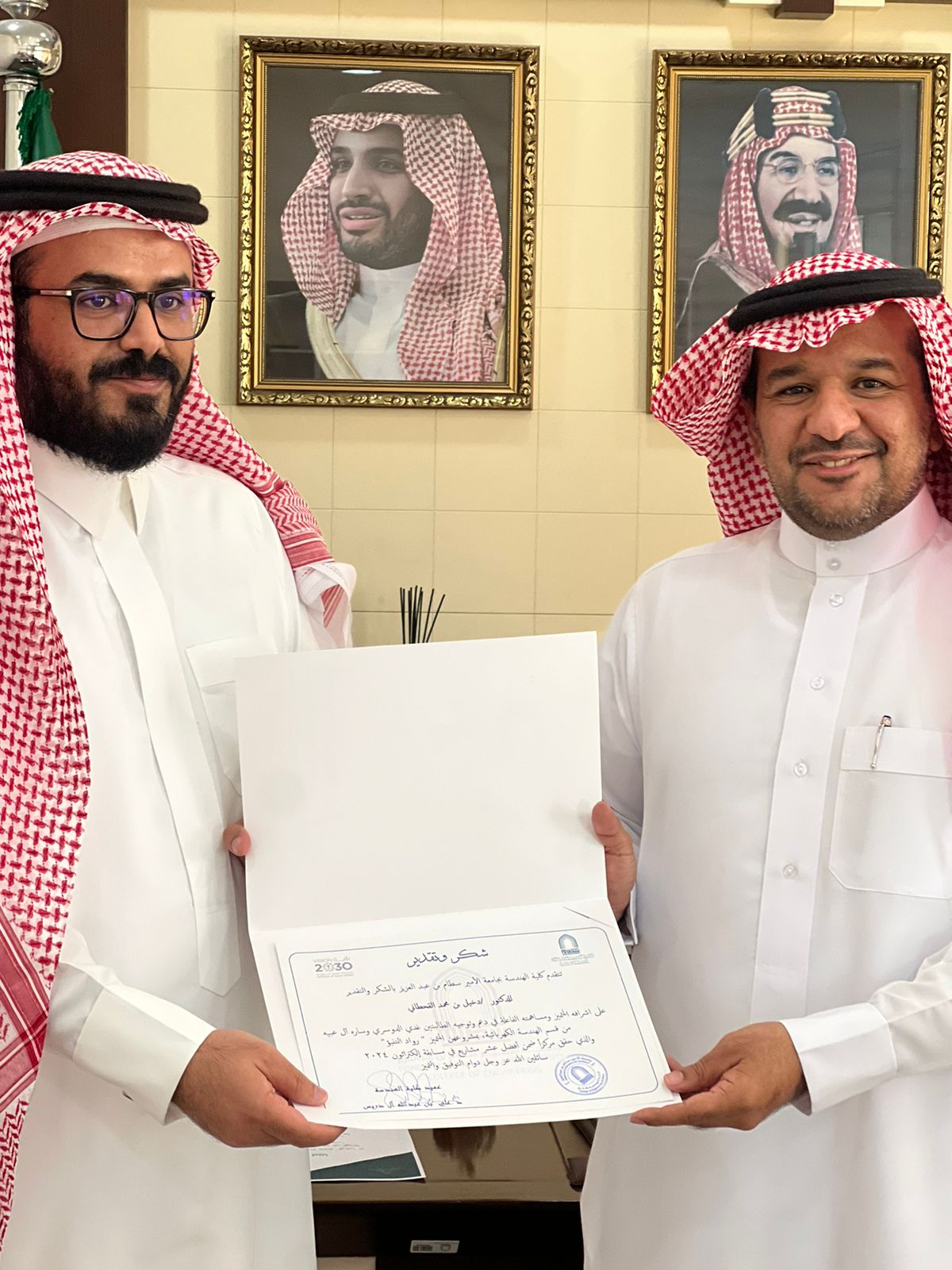 في خطوة تعكس الدعم المتواصل من كلية الهندسة للطلبة، قام عميد الكلية بتكريم الطالبتين غدي الدوسري وساره آل عبية اللَتين حقق مشروعهن "رواد التنبؤ" مركز ضمن افضل عشر مشاريع أولى مرشحة وذلك في إلكتراثون 2024 المنظم من قبل الهيئة السعودية لتنظيم الكهرباء بهدف إيجاد الحلول المستدامة التي تحسن مستقبل قطاع الكهرباء بالمملكة. وذلك بمشاركة نخبة من المرشدين وأكثر من 350 متنافس و35 فريق في ثلاث مسارات تنوعت ما بين تحسين تجربة المستهلك، ودمج الطاقة المتجددة، وتبني التقنيات الناشئة.
