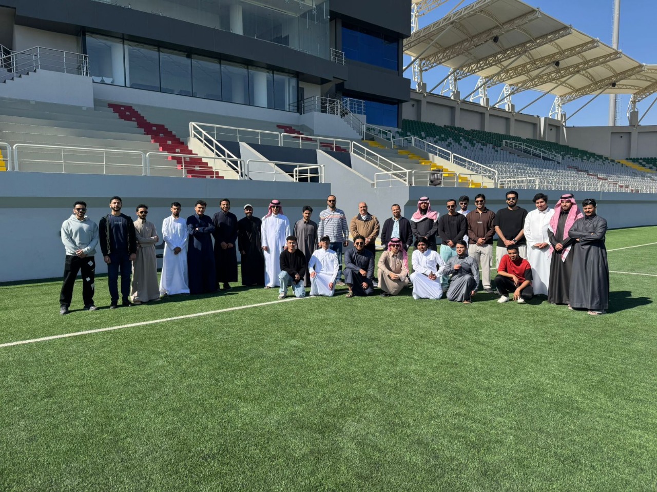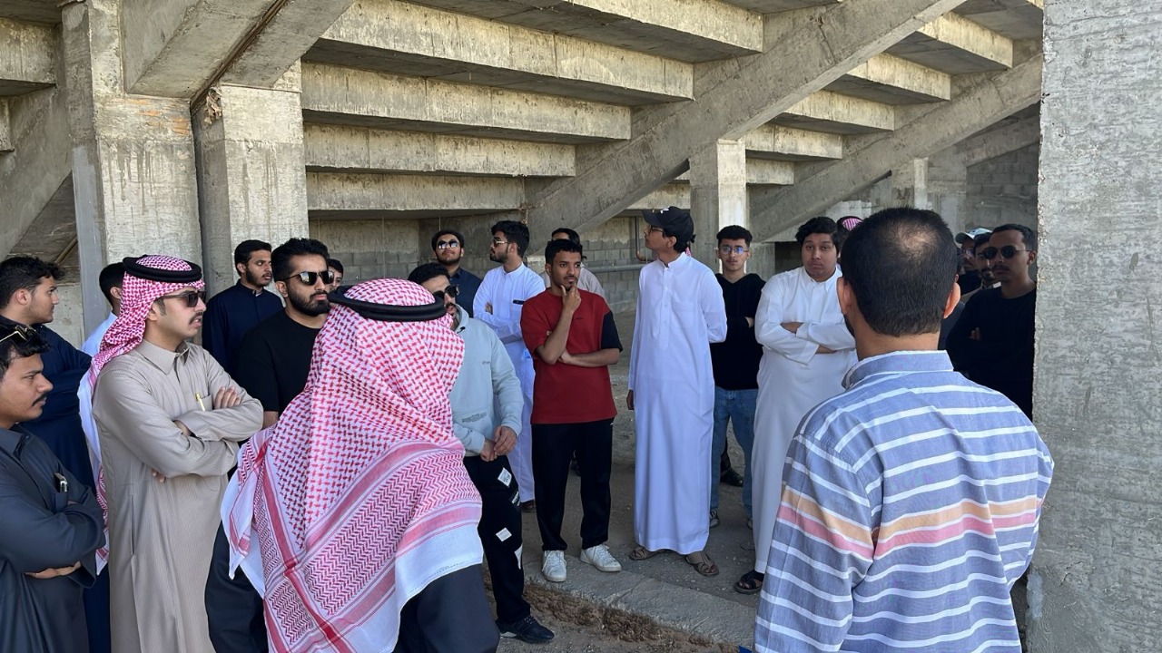 Part of the field visit conducted by Civil Engineering students to explore the structural systems of the concrete stadium stands and the metal trusses used to cover the stands at the university stadium in the university city of Al-Kharj. The visit aimed to link educational outcomes with practical applications, where challenges and issues faced during the project's execution phases were reviewed, along with solutions to overcome them.